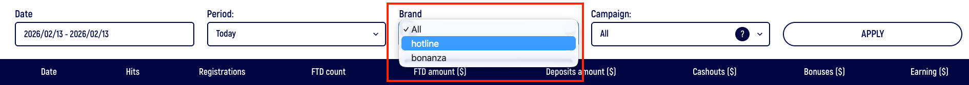 Use Brand ID to split your stats by brand. Go to Reports and Earnings Report --> Select Group by Brand and open the filters and select the brand in the brand filter option --> Right click somewhere and open the Inspect tool in your browser (before running the report) --> Click Submit button so your report show --> Go to the Inspect tool and click Network --> Click "dynamic-report-new/" in the Name section --> Click Payload --> Find siteid under "Form Data".